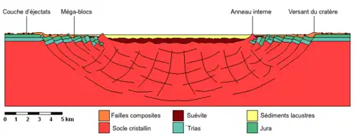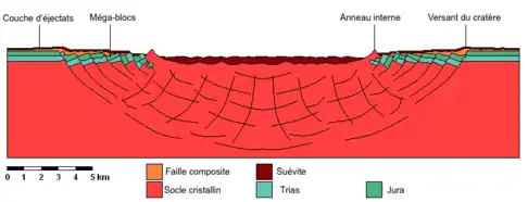 Initialement, le cratère primaire n’est pas stable : des roches roulent le long de sa paroi interne jusqu’à atteindre son centre, élargissant ainsi son diamètre d’environ 24 km. Le pic central n’est pas stable non plus et finit par s’affaisser. En contrepartie, certains matériaux enfouis sont à nouveau entraînés vers la surface, induisant ainsi la formation de l’anneau interne. Cette chaîne de collines concentrique située au centre du cratère est encore visible aujourd’hui. On y trouve en surface des roches magmatiques du socle qui se rencontrent en temps normal (c’est-à-dire en l’absence de cratère) 300 à 400 mètres plus en profondeur.