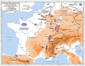- Strasbourg est encerclée à partir du 28 juin par les troupes de Guillaume de Wurtemberg qui se contente de l'observer : les régiments français l'évacuent le 9 août[8].