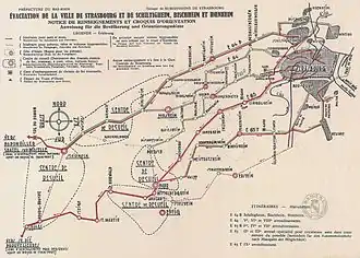 L'ordre d'évacuation de la ville de Strasbourg est donné dès la déclaration de mobilisation générale le . Dès le , alors que les militaires s'installent dans les ouvrages de la ligne Maginot, les habitants des communes situées en avant de cette ligne sont évacués vers des centres de regroupement situés dans les Vosges avec 30 kg maximum de bagages par personne. Les premiers convois vers le Sud-Ouest partent dès ce jour.