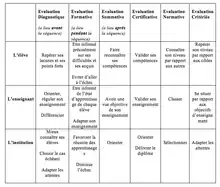 La docimologie est la discipline scientifique d'étude du déroulement des évaluations en pédagogie et notamment à la façon dont sont attribuées les notes par les correcteurs des examens scolaires. Lʼévaluation désigne le processus d'évaluation des compétences visant à mesurer le niveau d'apprentissage des élèves, par exemple à partir d'un référentiel extérieur. L'évaluation peut être ponctuelle ou une continue. Dans le domaine pédagogique, il existe plusieurs formes d'évaluations. En France, les plus courantes sont l'évaluation sommative et l'évalution formative[4]. L'évaluation sommative est utilisée pour mesurer les performances des élèves à un moment donné. Elle s'inscrit le plus souvent à la fin d'une ou plusieurs phases d'apprentissage et vise à vérifier les compétences aquises par les élèves. Elles se présentent souvent sous la forme de tests standardisés, d'examens finaux ou de travaux notés. Un exemple de ce type de formation est le baccalauréat à la fin du lycée. L'évaluation formative quant à elle, est intégrée tout au long du processus d'apprentissage afin de fournir des retours aux élèves comme aux enseignants. Elles visent à identifier les lacunes des élèves et à ajuster l'enseignement en conséquence. Elle peut également mettre en lumière des incompréhensions des élèves dûes à une mauvaise explication du professeur[5].