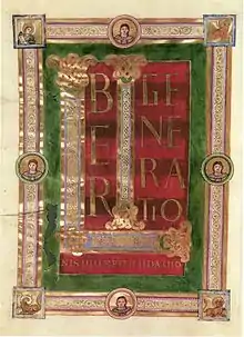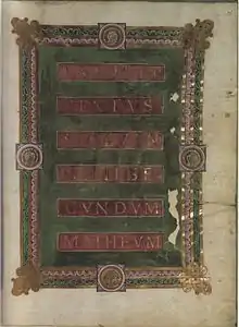 La datation du manuscrit n'est pas certaine, car l'évangéliaire ne contient pas de dédicace ou de miniature du commanditaire, qui était certainement un personnage de haut rang. Cependant le folio 16 recto, qui présente la page de titre de l'Évangile selon Matthieu, permet de le situer dans la chronologie, car il montre quatre médaillons au milieu de chaque côté de la bordure, qui contiennent chacun le portrait d'un souverain de l'époque avec une inscription le désignant: