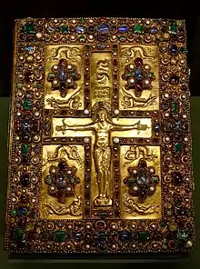 La première de couverture est très richement parsemée de grosses pierres précieuses et présente un bas relief repoussé[7]. La composition est également centrée sur une croix avec une scène de crucifixion avec une figure de Jésus-Christ en croix et des scènes beaucoup plus petites de la Vierge Marie et de Jean (apôtre). Chacun d'eux se trouve dans un compartiment sous les bras de la croix, associé à des figures féminines iconographiques inhabituelles ; les compartiments correspondant au-dessus des bras contiennent chacun deux anges. Les identifications de ces figurent inférieures varient ; elles sont décrites par la Morgan Library comme des pleureuses anonymes, « deux figures féminines échevelées considérées comme des personnifications d'âmes chrétiennes saluant leur Rédempteur », comme le mentionne la note de dossier[8], mais Peter Lasko les mentionne comme « la figure curieusement dupliquée de sainte Marie-Madeleine (? ) »[9]. Pour Needham, ce sont Marie-Madeleine et Marie (femme de Cléophas)[10]. Les huit personnages sont représentés accroupis ou de côté, ou planant à l'horizontale dans le cas des anges, au-dessus et au-dessous de grappes de pierres précieuses.