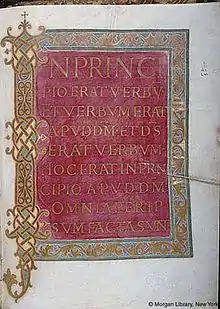 - f167v et 168r : incipit de Jean (évangéliste), similaire, avec l'initiale I en bas à gauche de la 168r.