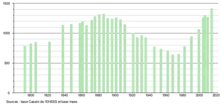 L'évolution du nombre d'habitants est connue à travers les recensements de la population effectués dans la commune depuis 1793. Pour les communes de moins de 10 000 habitants, une enquête de recensement portant sur toute la population est réalisée tous les cinq ans, les populations légales des années intermédiaires étant quant à elles estimées par interpolation ou extrapolation[6]. Pour la commune, le premier recensement exhaustif entrant dans le cadre du nouveau dispositif a été réalisé en 2004[7].