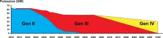 L'OPECST propose également un basculement, pendant la deuxième partie du XXIe siècle, vers la IVème génération, à nouveau au rythme de non-remplacement d'un réacteur sur deux. La part de production électronucléaire passerait ainsi, vers 2100, à 30 % des capacités totales actuelles. La France profiterait alors, d'une part des réserves d'uranium appauvri et de plutonium qu'elle aura accumulées lui permettant de renforcer son indépendance énergétique, et d'autre part de réacteurs de IVe génération pour optimiser le cycle aval de la filière (déchets nucléaires)[24].