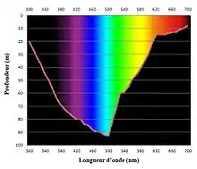 Étant donné que le milieu de vie des organismes peut modifier très nettement la qualité de la lumière incidente (généralement issue du soleil), les systèmes de communication visuelle sont soumis à des contraintes environnementales très variables selon le milieu, engendrant des adaptations spécifiques. Une illustration de ce phénomène sont les conséquences des différences d’atténuation des couleurs dans l’océan, selon le gradient de profondeur (cf. figure 3), sur la coloration des organismes marins. En effet, la plupart des organismes mésopélagiques et mésobenthiques sont soit rouges, soit noirs, ce qui, dans cet environnement où la lumière rouge est absente (car absorbée par la colonne d’eau supérieure), favorise le camouflage (cf. 3.4.2.1)). En contrepartie, les prédateurs de la zone ont développé des capacités de bioluminescence (cf. 3.4.2.5)) pour augmenter leur pouvoir de détection des proies[20].
