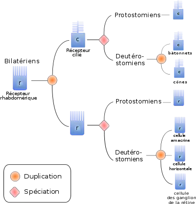 Deux types de cellules photoréceptrices ont probablement évolué chez les Urbilatériens. Chacune a augmenté sa surface membranaire afin de stocker plus de pigments et ainsi améliorer la capture des photons : les cellules ciliées, par multiplication des cils stockant l’opsine c ; les cellules rhabdomériques par expansion apicale stockant des opsines-r.