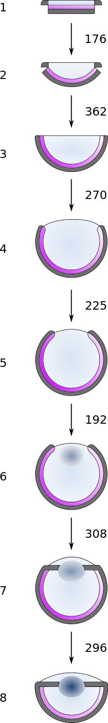 Nilsson et Pelger[28] ont considéré l’émergence de l’œil comme une succession d’étapes transformant à la fois la physiologie et la morphologie de l’élément récepteur en 1829 étapes à travers 350,000 générations soit 500,000 ans (cf. figure 4). La première innovation est décrite comme l’initiation de cellules photosensibles se développant entre des cellules transparentes et cellules pigmentées. La sensibilisation aux variations lumineuses confère un avantage évolutif dans l’appréhension de l’espace qui a permis aux gastéropodes tels que les patelles d’effectuer des ascensions verticales afin de se nourrir.