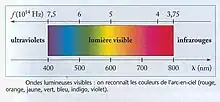 Un signal visuel est un ensemble d’ondes électromagnétiques captées par les structures réceptrices associées à la vue (e.g. l’œil chez la plupart des animaux). Le spectre visible correspond à l’ensemble des longueurs d’onde perçues par un système sensoriel visuel donné (e.g. chez l’Homme : 380 à 780nm). Les variations des longueurs d’onde coïncident avec les variations de perception de couleur. De nombreux organismes possèdent des structures réceptrices de la vision capables de capter la lumière pour des longueurs d’onde inférieures (vision ultra-violette) ou supérieures (vision infra-rouge) aux limites du spectre visible humain (cf. figure 2).