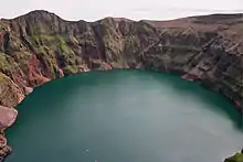 Vue de l'intérieur du cratère de l'île Kasatochi avec son lac de cratère en 2004.