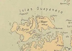 L'île Wager est située dans l'archipel Guayaneco, à 1 600 km au sud de Santiago, dans la partie sud du golfe de Penas, dans le sud de l'océan Pacifique. Elle mesure 18 km de long sur son axe NW-SE et 10 km de large. Des deux îles principales qui composent l'archipel, l'île Byron est la plus grande et l'île Wager la plus petite. Elle est séparée de l'île Byron par Paso Rundle[29] et séparée de l'Islote San Pedro par Bahía Acosta[30]. L'île Wager et l'île San Pedro ferment au nord-ouest le canal Messier, tandis que la péninsule de Larenas ferme le terminus nord-est [31]. Un phare ( NGA 2044) se dresse sur l'Islote San Pedro. Le canal Messier est régulièrement traversé par de grands cargos et ferries de croisière,[33].