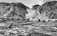 Il existe des incertitudes sur la première implantation humaine dans l'archipel des îles Vestmann mais la première personne à avoir habité sur Heimaey est Herjólfur Bárðarson qui construit sa maison à l'endroit qui porte son nom, Herjólfsdalur, en français la « vallée d'Herjólfur »[19],[20]. Dans le Landnámabók, l'ouvrage décrivant la colonisation de l'Islande, Herjólfur Bárðarson se serait établi à Heimaey aux alentours de l'an 900 mais les fouilles des ruines de sa maison retrouvées en 1971 indiquent que l'endroit a été habité depuis l'an 800[20].