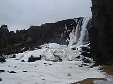 Vue de l'Öxarárfoss partiellement gelée en hiver.
