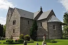 Une pierre runique, désignée sous le nom de DR 391 dans le catalogue Rundata, se trouve dans le cimetière près de l'ancienne église mais a été trouvée à l'origine dans sa tour. Il a une inscription runique qui a été transcrite en vieux norrois comme suit : « Barni/Biarni ok Sibbi ok [T]ofi þeʀ resþu sten æftiʀ Kætil, faþur sin. Kristr hialpi hans siol Barni/Biarni ok Sibbi ok [T]ofi þeʀ resþu sten æftiʀ Kætil, faþur sin. Kristr hialpi hans siol », en français : « Barni/Biarni et Sibbi et Tófi ils ont élevé (la) pierre à la mémoire de Ketill, leur père, Que le Christ aide son âme » [8]. Une pierre similaire, DR 392, a été trouvée dans l'ancien mur du porche et se dresse maintenant entre l'ancienne et la nouvelle église. Son inscription a été transcrite comme : « Barni/Biarni ok Tofi ok Asgotr letu resa sten æftiʀ Sibba, broþur sin. Kristr sæl hialpi ». Cela se traduit par : « Barni/Biarni et Tófi et Ásgautr ont fait lever (la) pierre à la mémoire de Sibbi, leur frère. Que le Christ aide (son) âme ». Cette pierre présente également au revers un dessin ornemental représentant une croix en forme d'hélice[9]. Une troisième pierre, DR 394, a été retrouvée légèrement enfouie dans le cimetière et a également été placée dans la zone située entre les deux églises. Son inscription a été transcrite comme : « Øþi ok Swen ok Øþgiʀ resþu sten æftiʀ Gunulf, broþur sin goþan, ok æftiʀ Gunhild, moþur.». En français, cela se lit comme suit: « Auði et Sveinn et Auðgeirr ont élevé la pierre à la mémoire de Gunnulfr, leur bon frère, et à la mémoire de Gunnhildr, (leur) mère»[10].
