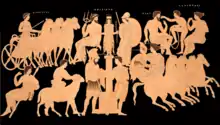 À la suite d'un oracle, Œnomaos savait qu'il serait tué par son gendre. Il décida d'accorder la main de sa fille Hippodamie à quiconque serait capable de le battre dans une course de chars[1] ; nombre de concurrents furent ainsi mis à mort par le roi toujours vainqueur, qui montait sur un char dont les chevaux imbattables et l'armement lui avaient été donnés par son père Arès. Seul Pélops réussit à vaincre le roi, dont le char se brisa et qui mourut traîné par ses chevaux. Selon les variantes des récits de la course, Pélops remporta la course par son seul talent de cocher, ou bien grâce à un attelage merveilleux de chevaux ailés, ou bien grâce à l'aide de Myrtilos, le cocher d'Œnomaos, qu'il convainquit de saboter le char de son maître afin qu'il se brise pendant la course.