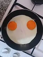 La poêle (ou un le plat à poignées) en tôle d'acier ou inox de 2 ou 3 mm, elle permet de cuire à des températures plus élevées que le plat, ces hautes températures correspondent aux fried eggs[23], idéales pour saisir et obtenir un blanc croustillant[24]. Actuellement elles sont enduites d'un revêtement antiadhésif[25]. Les diamètres sont adaptés au pain choisi, par exemple 12,7 cm pour couvrir un muffin ou un bagel[26].