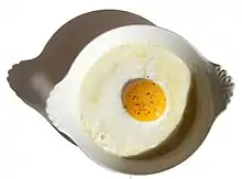 On distingue l'œuf au (ou sur le) plat de l'œuf miroir ou œuf au miroir dont le blanc qui recouvre le jaune est légèrement cuit : non liquide mais pas coagulé opaque, on obtient l'effet miroir en terminant la cuisson au four ou à la salamandre[2],[3]. Le Dictionnaire de l'Académie (1777) donne œuf sur le plat synonyme d'œuf miroir[4].