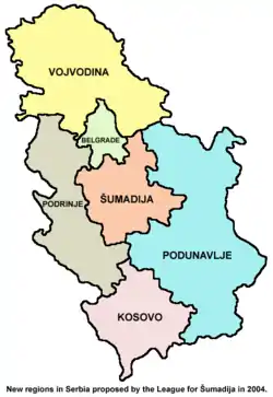 Certains partis politiques serbes, et notamment le Parti démocratique de Serbie et la Coalition de la Šumadija, proposent la création de nouvelles unités administratives en Serbie, remplaçant les actuelles provinces autonomes par rapport à la Serbie dite centrale. Selon cette proposition, la Serbie serait divisée en six régions :