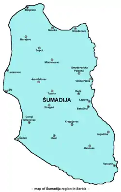 La région de Šumadija était autrefois couverte de forêts denses ; son nom provient du mot serbe šuma, qui désigne « la forêt ». La ville de Kragujevac est la capitale historique de la région, ainsi que le centre administratif du district de Šumadija (en serbe : Šumadijski okrug) en Serbie centrale.