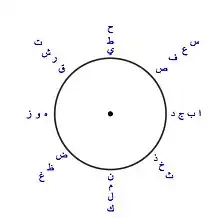 Les tableaux ci-dessous donnent la valeur de chacune des vingt-huit lettres de l'alphabet arabe[4]. À noter que ces tableaux présentent, du premier au dernier, un ordre alphabétique ancien (dit « ordre levantin ») dans lequel le classement des lettres correspond à la progression des nombres. Le classement actuel de l'alphabet arabe suit un ordre différent (voir tableau à droite), si bien que les nombres sont dans le désordre.