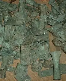 En Chine, la métallurgie du bronze est introduite progressivement dans l'Ouest et le Nord de la Chine, dans des cultures néolithiques qui ont pratiqué la culture et l'élevage en complément des pratiques de chasseurs-cueilleurs. Cette introduction du bronze apparaît en particulier dans la culture de Qijia (2200-), au Gansu, peut-être par le corridor du Hexi, et dans celles de Zhukaigou (2000-) et du Xiajiadian inférieur (2000-), par des contacts permanents avec des pasteurs nomades d'Asie centrale ou de Sibérie du Sud, avec en particulier la famille des cultures d'Afanaseivo (3300-3200 à 2600-) et d'Andronovo (2100-)[25], voire avec les « cultures Seima-Turbino » (1700-). Ce sont des technologies de fonte à deux moules ou de forge, voire à cire perdue. L'expansion de la fonte du bronze à multiples moules se développe ensuite à Erlitou (1900-1800 à ) et à la période d'Erligang (1600-1500 à 1400-) puis avec la dynastie Shang (1570-). La culture Sanxingdui, dans le Sichuan lui est contemporaine (2800 à ), mais développe d'autres techniques métallurgiques. Cette dernière culture n'est documentée que par l'archéologie, les écrits chinois ne semblant jamais la mentionner. Le bronze est progressivement utilisé avec le fer à partir de la dynastie Zhou.
