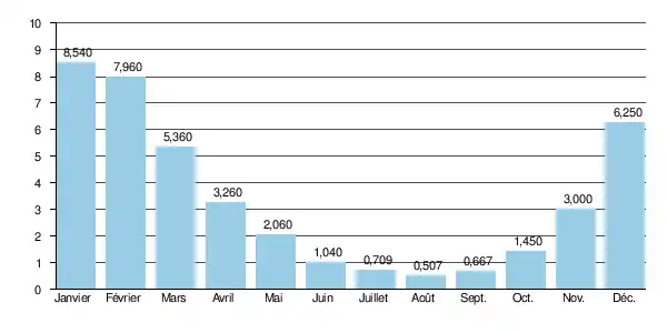 Ainsi les QIX 2 et QIX 5 valent respectivement 72 et 120 m3/s. Le QIX 10 est de 150 m3/s, le QIX 20 de 180 m3/s, tandis que le QIX 50 se monte à 220 m3/s.