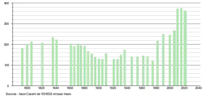 L'évolution du nombre d'habitants est connue à travers les recensements de la population effectués dans la commune depuis 1793. Pour les communes de moins de 10 000 habitants, une enquête de recensement portant sur toute la population est réalisée tous les cinq ans, les populations légales des années intermédiaires étant quant à elles estimées par interpolation ou extrapolation[18]. Pour la commune, le premier recensement exhaustif entrant dans le cadre du nouveau dispositif a été réalisé en 2005[19].