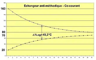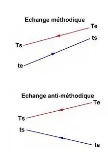 - à co-courant (ou échangeur anti-méthodique) : les deux fluides circulent parallèlement et dans le même sens. Dans un échangeur anti-méthodique, la température de sortie du fluide froid est nécessairement moins élevée que la température de sortie du fluide chaud ;