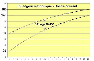 - à contre-courant (on parle aussi d'échangeur méthodique) : les deux fluides circulent parallèlement mais dans les sens opposés. Dans un échangeur méthodique, le coefficient d'échange est sensiblement supérieur à celui d'un échangeur anti-méthodique et la température de sortie du fluide froid peut être plus élevée que la température de sortie du fluide chaud ;
