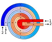 - en épingle (ou en U) : le premier circuit fait un aller-retour dans une enveloppe que le second fluide parcourt. Cette configuration est comparable à un échangeur à courant parallèle sur la moitié de la longueur et pour l'autre moitié à un échangeur à contre-courant ; des chicanes sur le second circuit peuvent également former des échangeurs à courants croisés ;