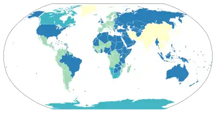 - les États-Unis et, depuis quelques décennies, la plupart des pays anglophones — le Canada (en anglais)[22], le Royaume-Uni (depuis 1974), l'Irlande, etc. — ainsi que Porto Rico (un territoire américain hispanophone) ;