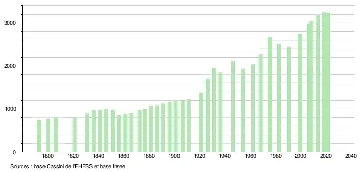 L'évolution du nombre d'habitants est connue à travers les recensements de la population effectués dans la commune depuis 1793. Pour les communes de moins de 10 000 habitants, une enquête de recensement portant sur toute la population est réalisée tous les cinq ans, les populations légales des années intermédiaires étant quant à elles estimées par interpolation ou extrapolation[29]. Pour la commune, le premier recensement exhaustif entrant dans le cadre du nouveau dispositif a été réalisé en 2008[30].