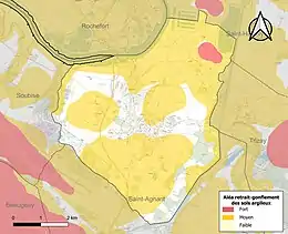 Le retrait-gonflement des sols argileux est susceptible d'engendrer des dommages importants aux bâtiments en cas d’alternance de périodes de sécheresse et de pluie. 71 % de la superficie communale est en aléa moyen ou fort (54,2 % au niveau départemental et 48,5 % au niveau national). Sur les 1 597 bâtiments dénombrés sur la commune en 2019, 784 sont en aléa moyen ou fort, soit 49 %, à comparer aux 57 % au niveau départemental et 54 % au niveau national. Une cartographie de l'exposition du territoire national au retrait gonflement des sols argileux est disponible sur le site du BRGM[24],[Carte 2].