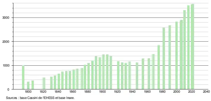 L'évolution du nombre d'habitants est connue à travers les recensements de la population effectués dans la commune depuis 1793. Pour les communes de moins de 10 000 habitants, une enquête de recensement portant sur toute la population est réalisée tous les cinq ans, les populations légales des années intermédiaires étant quant à elles estimées par interpolation ou extrapolation[27]. Pour la commune, le premier recensement exhaustif entrant dans le cadre du nouveau dispositif a été réalisé en 2005[28].