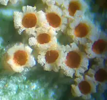 Les écidies sont d'abord incluses dans le parenchyme du support sous la forme de protoécidies, puis deviennent de plus en plus proéminente (comme une sorte de gobelet) suite à l'accroissement de ses éléments constitutifs jusqu'à éclatement de l'épiderme de l'hôte. Elles sont en général finement verruqueuses à épineuses et unicellulaires[4].