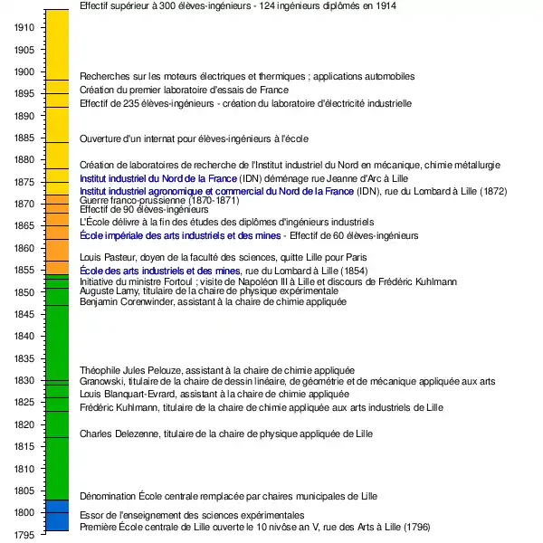 À Lille, l'année 1795 est le point de départ[SSAAL 2] sous la Première République de l'enseignement scolaire systématique du dessin géométrique et de la physique, dont des applications techniques sont les arts décoratifs et appliqués aux procédés textiles et la construction de machines, et de l'enseignement scolaire systématique de la chimie, avec ses innovations techniques dans les domaines agricoles, des brasseries et distilleries, des teintures et blanchiments. Le rôle de l'instruction comme facteur d'accoutumance au système technique moderne favorisant le développement économique justifie la volonté exprimée dès 1802 de voir établir à Lille une « École spéciale des arts mécaniques et de chimie ».