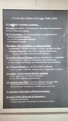 Uriage a suscité d'autres expériences communautaire (comme La Vie nouvelle)[43], et à plus long terme le souci pédagogique et éducatif deviendra l'une des principales préoccupations : Peuple et culture déjà évoqué, l'Institut collégial européen (Gadoffre), Jean Leveugle dans le cadre de l'éducation des adultes à l'UNESCO, Louis Moreau à l'université du troisième âge de Grenoble, Jean Barthalais au centre de formation professionnelle des adultes, Simon Nora à l'ENA…