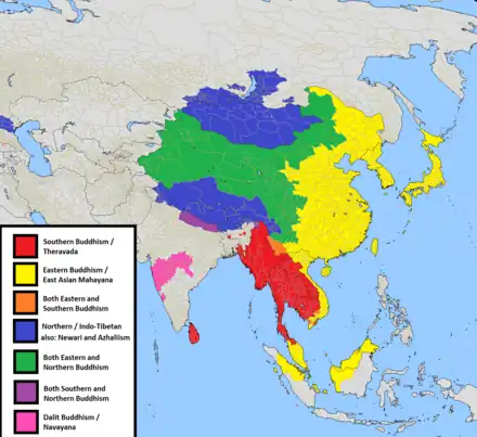 - Le theravāda (Sri Lanka, Birmanie, Thaïlande, Laos, Cambodge, Viêt Nam du Sud) est la seule des écoles du hīnayāna à avoir survécu de nos jours. Le theravāda se fonde mythiquement sur l'orthodoxie définie lors du premier concile peu après la mort de Gautama Bouddha. L'histoire des conciles bouddhiques et des débuts du theravāda est en fait mal documentée, mais il est certain que ce courant a des racines anciennes et a été relativement peu influencé par le mahāyāna. Principalement implanté en Indochine, comprenant environ 150 millions de pratiquants, il se divise en deux branches différant essentiellement par la transmission de l'ordination.