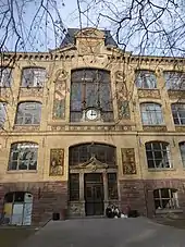 Dans un premier temps, l’École occupe comme locaux l’ancienne boucherie et des salles de l’Académie. Le , la décision est prise de construire un nouveau bâtiment pour l’École des arts décoratifs, à l'emplacement du jardin botanique, Doktersgarte, entre la rue Prechter et la rue de l'Académie. Ce jardin avait, durant le siège de 1870, servi de cimetière provisoire. Il fallut déplacer les dépouilles ce qui explique la présence du monument commémoratif encore présent actuellement dans le jardin de l'école. Construit en 1892 par les architectes Johann Karl Ott et Édouard Roederer, ce bâtiment est à lui seul un manifeste, le style de l’édifice marquant par sa sobriété une rupture par rapport à l’éclectisme ambiant. Le bâtiment est construit en brique, matériau non noble, plaçant ainsi d’emblée l’École du côté des arts industriels. Conçue dans la mouvance du Deutscher Werkbund, la construction de l’École mobilise différents corps de métier : outre les architectes, le directeur Anton Seder (en) dessine l’ornementation de la façade, un ancien élève, Léon Elchinger, réalise les décors en céramique, et un maître verrier met en place les vitraux de l’entrée. L’iconographie des panneaux en céramique de la façade énonce le programme de l’école : architecture, peinture et sculpture sont fondées sur la connaissance de la géométrie, de l’archéologie et de la science. Chacune de ces disciplines est représentée de façon allégorique par une figure féminine. Moins académiques, les panneaux d’allège font uniquement appel à des motifs floraux et végétaux, annonçant un enseignement basé sur l’imitation des formes de la nature.