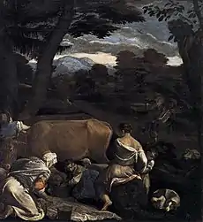 Les avis sont partagés sur la peinture vénitienne au XVIIe siècle, beaucoup la considèrent comme une période ou l'activité créatrice diminue, décline[41]. La première partie du siècle voit se perpétuer la tradition établie à la fin du XVIe siècle. Palma le Jeune est sûrement l'artiste le plus intéressant de ce point de vue, ancien élève du Titien, il peint davantage dans le style du Tintoret et de Jacopo Bassano.