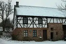 - Les toilettes de l'école de Portz, quartier de Merzkirchen, près de Saarburg. Il s'agit là d'une construction à pans de bois remplie de brique. La maisonnette ne survécut aux changements de cultures sanitaires que parce que le directeur de l'école la transforma en poulailler[12].