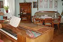 La chambre Biedermeier représentative a des rideaux transparents sur des grandes fenêtres. Les meubles à ornements sont discrets et mettant plus l'accent sur les effets des veinures du bois. Le début de la période est marqué par la préférence pour les bois clairs comme le bois de poirier et de bouleau ou encore de cerisier. Pendant les années 1950 et 60 s'ajoutèrent, sous l'influence des Français, des bois plus foncés comme celui du noyer et le bois d'acajou. Le reste du mobilier était composé d'un secrétaire, des fourneaux en fonte d'acier et un piano rectangulaire. Une chambre à coucher et un autre local de 1840 dans lequel le café était servi. À titre de comparaison, se trouve à côté une salle de thé dans le style néo-biedermeier des années 1910.