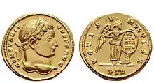 Frappé pour la première fois à l'atelier de Trèves vers 310, le solidus est une monnaie d’or créé par Constantin Ier (r. 306 – 337) pour financer son armée; il remplace alors l’aureus ou denier d’or qui avait jusque-là été la monnaie officielle de l’empire[87]. Valant à la fin du IVe siècle 1/72e de livre et pesant 4,5 g, il restera le pivot du système monétaire byzantin pendant dix siècles[88].