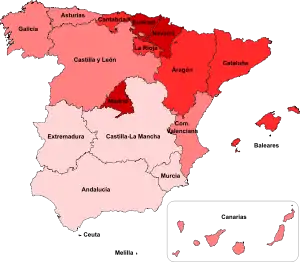 La communauté autonome du Pays basque est la communauté autonome la plus riche avec 31 952 euros PIB par habitant devant de la communauté de Madrid, la Navarre, la Catalogne, l'Aragon, les Baléares, La Rioja et la Cantabrie. Elles bénéficient tout à la fois d'une relative proximité avec le cœur économique de l'Union Européenne, et d'un dynamisme structurel au niveau du tourisme. Ils sont au-dessus de la moyenne espagnole 23 877 euros PIB par habitant.