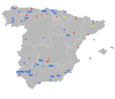 En 2009, l’Espagne a un sol renfermant plus de cent produits minéraux mais ceux-ci ne sont pas en quantité importante. Les principales richesses exploitées en Espagne sont le plomb, les pyrites de cuivre, le mercure et le fer, base de l’industrie lourde. On ne peut en extraire que dix-sept en assez grande quantité :