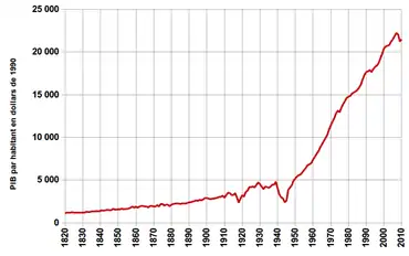Entre 1946 et 1973, la France connaît une période de très forte croissance (en moyenne 5 % par an) que l’économiste Jean Fourastié a, a posteriori, qualifiée de « Trente Glorieuses ». Cette croissance est beaucoup plus élevée que la croissance économique de long terme de la France (cf. graphique) : de 5 % au lieu d'un peu plus de 2 % par an pour le PIB par habitant. Cette croissance économique exceptionnelle va permettre à la France, en retard dans les domaines de la technologie et de l'organisation de la production, et dont l'appareil de production avait été fortement détruit par la guerre, de rattraper une grande partie de son retard sur les États-Unis: si en 1950, le revenu moyen d’un Français représente à peine plus de la moitié de celui d’un habitant des États-Unis (55 %), il en atteint les quatre cinquièmes en 1973.