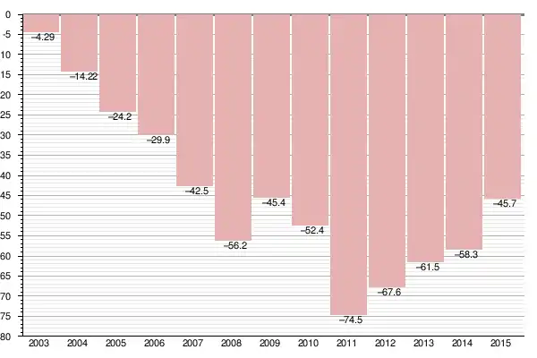 En 2016, la France descend à la 7e place pour les exportations étant devancée par la Corée du Sud[70]. Le déficit commercial progresse de plus de trois milliards d'euros pour dépasser les 48 milliards d'euros[71] alors que l'Allemagne connaît la même année un excédent commercial record de 252,6 milliards d'euros[72]. Le total des déficits cumulés du commerce extérieur français sous le quinquennat de François Hollande atteint 281 milliards d'euros[73].