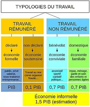 Pour certains, l'économie informelle est un simple résidu de l'économie de l'ère préindustrielle (l'économie familiale), un manque de l'État-providence et de la société des loisirs (l'économie conviviale) ou le résultat des perversions de l'économie moderne (le travail au noir).