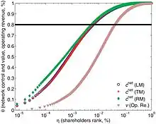 Les acteurs économiques (STN et actionnaires) sont classés par importance décroissante, donnée par . Un point de données situé en () correspond à une fraction des principaux acteurs économiques détenant cumulativement la fraction du contrôle, de la valeur ou des revenus d'exploitation du réseau. Les différentes courbes se réfèrent au contrôle du réseau calculé avec trois modèles (LM, TM, RM), voir l'annexe S1, section 3.1, et aux revenus d'exploitation. La ligne horizontale indique une valeur égale à . Le niveau de concentration est déterminé par la valeur de l'intersection entre chaque courbe et la ligne horizontale. L'échelle est semi-logarithmique.