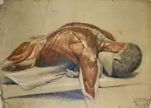 Pour les artistes, l'écorché dans le cadre de l'anatomie artistique s'impose comme un exercice académique au XIXe siècle, pratiqué dans les écoles des Beaux-Arts, généralement sous la direction de médecins (ce qui n'est plus le cas aujourd'hui[14]), en complément de la pratique du dessin d'après le modèle vivant. L'utilisation de l'anatomie et de la connaissance des écorchés peut se lire dans les études d'hommes pour le tableau Le Radeau de La Méduse par Géricault. L'étude des écorchés se fait soit à travers les planches anatomiques ou les sculptures comme on peut le voir avec les études de Michel Chapus[15], de David [16] ou les différents dessins d'Odilon Redon [17] d'après l'écorché de Houdon, bras tendu ou en version bras replié, l'Écorché combattant d'Eugène Caudron[18], ou même à partir de sculptures antiques comme le Gladiateur Borghèse, ou le Doryphore[19].
